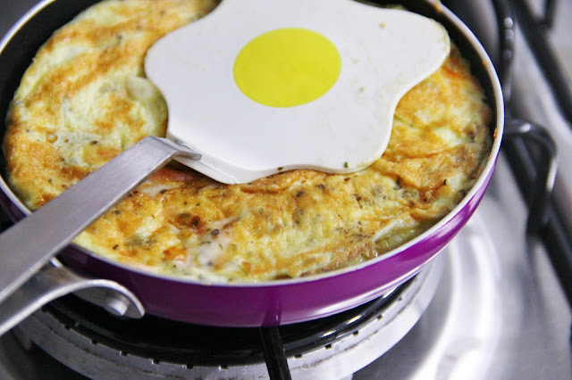 Omelete é a comida oficial de quando as coisas saem do esperado, não é? É rápido e fácil. Eu enjoei um pouco depois da faculdade. Fazia muito. Omelete é a vida de quem mora sozinho. Diz se não fica muito mais charmosa essa porção individual, numa frigideira cor de uva que vem com espátula de ovo. fofura, né? É baratinho e vende no pão de açúcar. Eu dei uma para a minha madrinha (agora não lembro se foi a vermelha ou a azul claro), quando fui na sua casa nova, pela primeira vez! Não é legal como opção de presentear? Fica bonito no prato também. Essa versão todos os ingredientes são misturados antes de ir para o fogão.